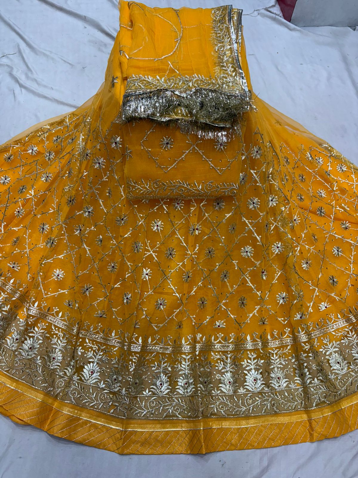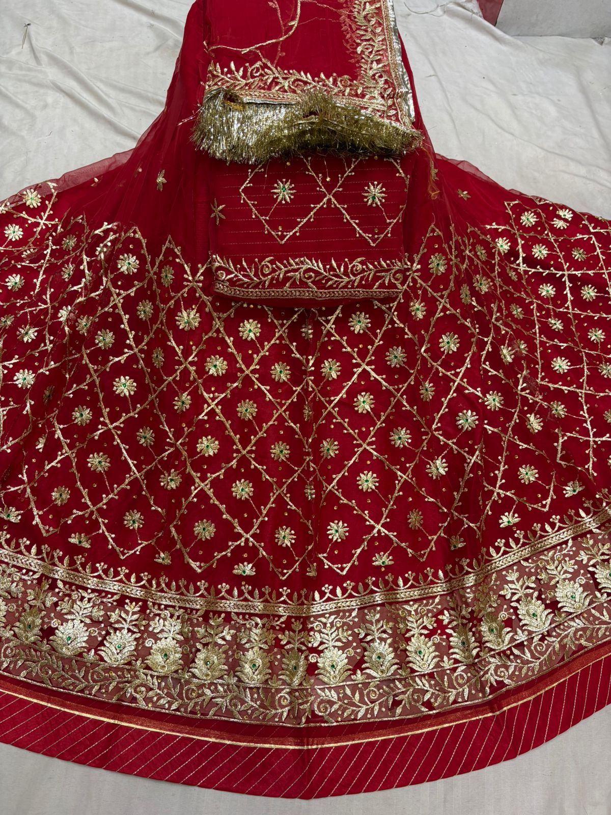 🪔 Full Heavy Jari Work – Intricate zari embroidery across lehenga, kurti, and odhna for a royal appeal.
