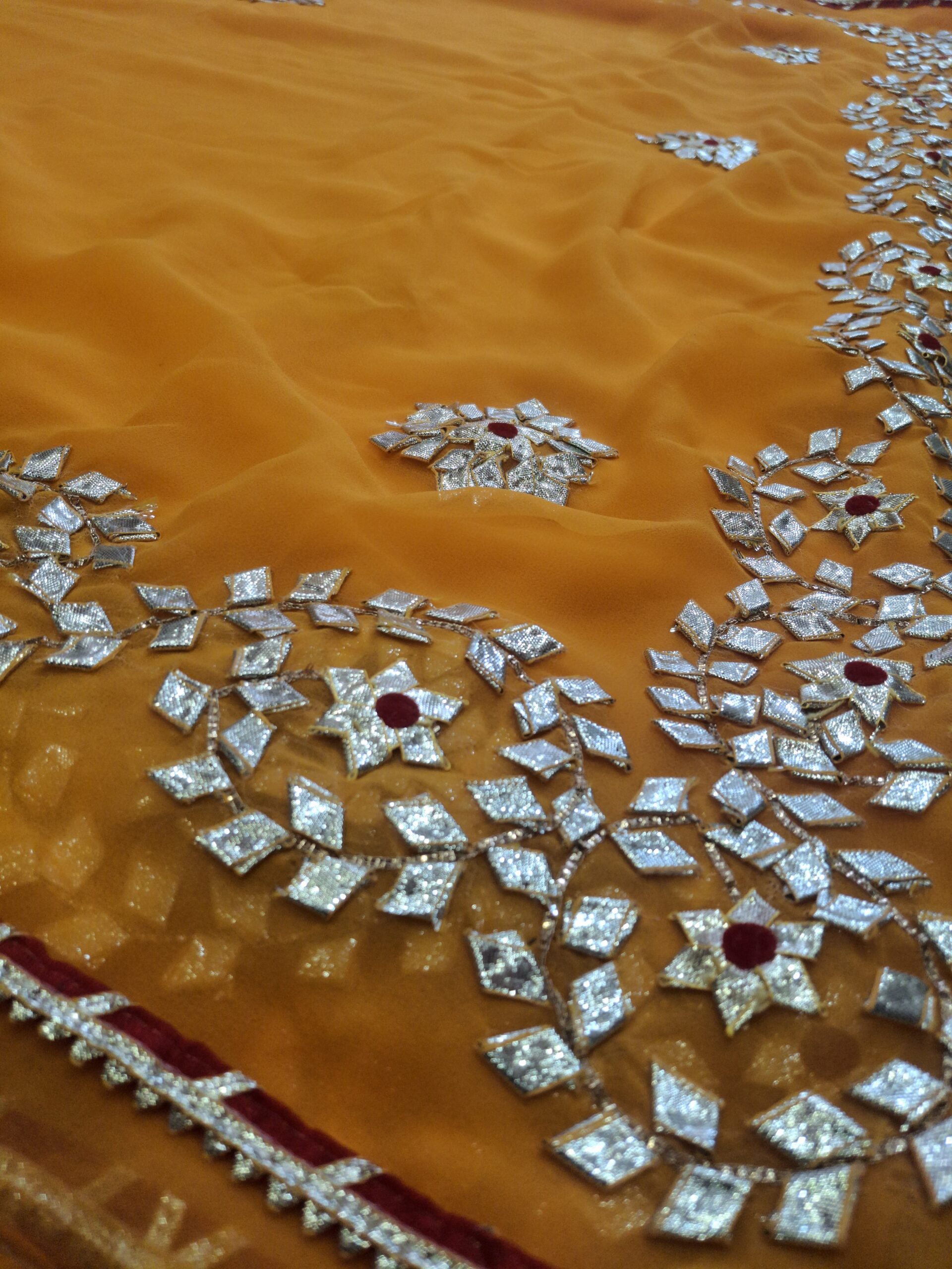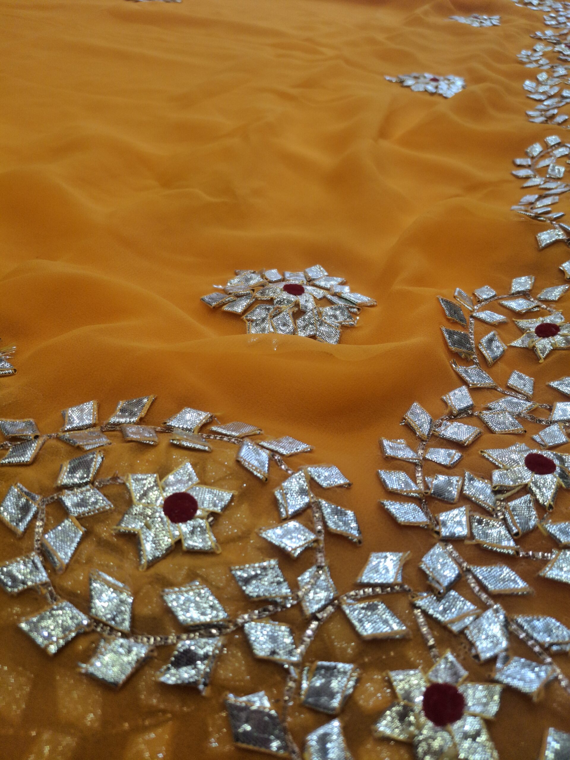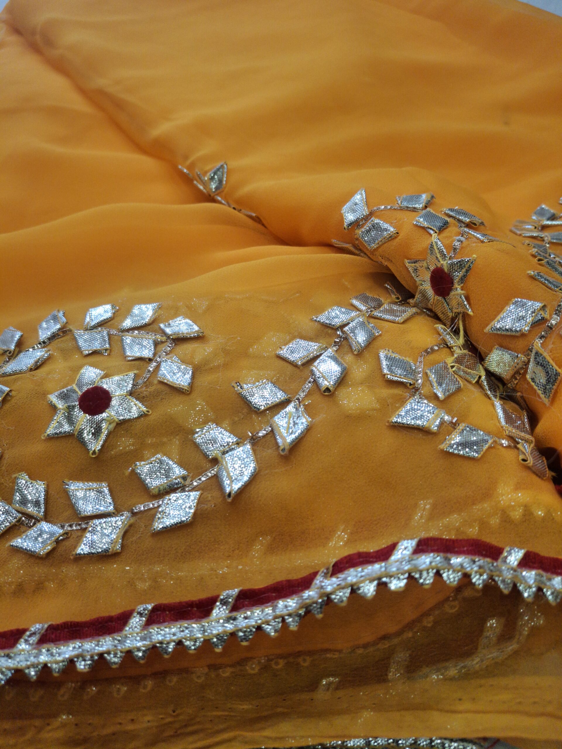 Step into the spotlight with our exquisite Kachi Gota Work Party Wear Saree, crafted from luxurious georgette material.