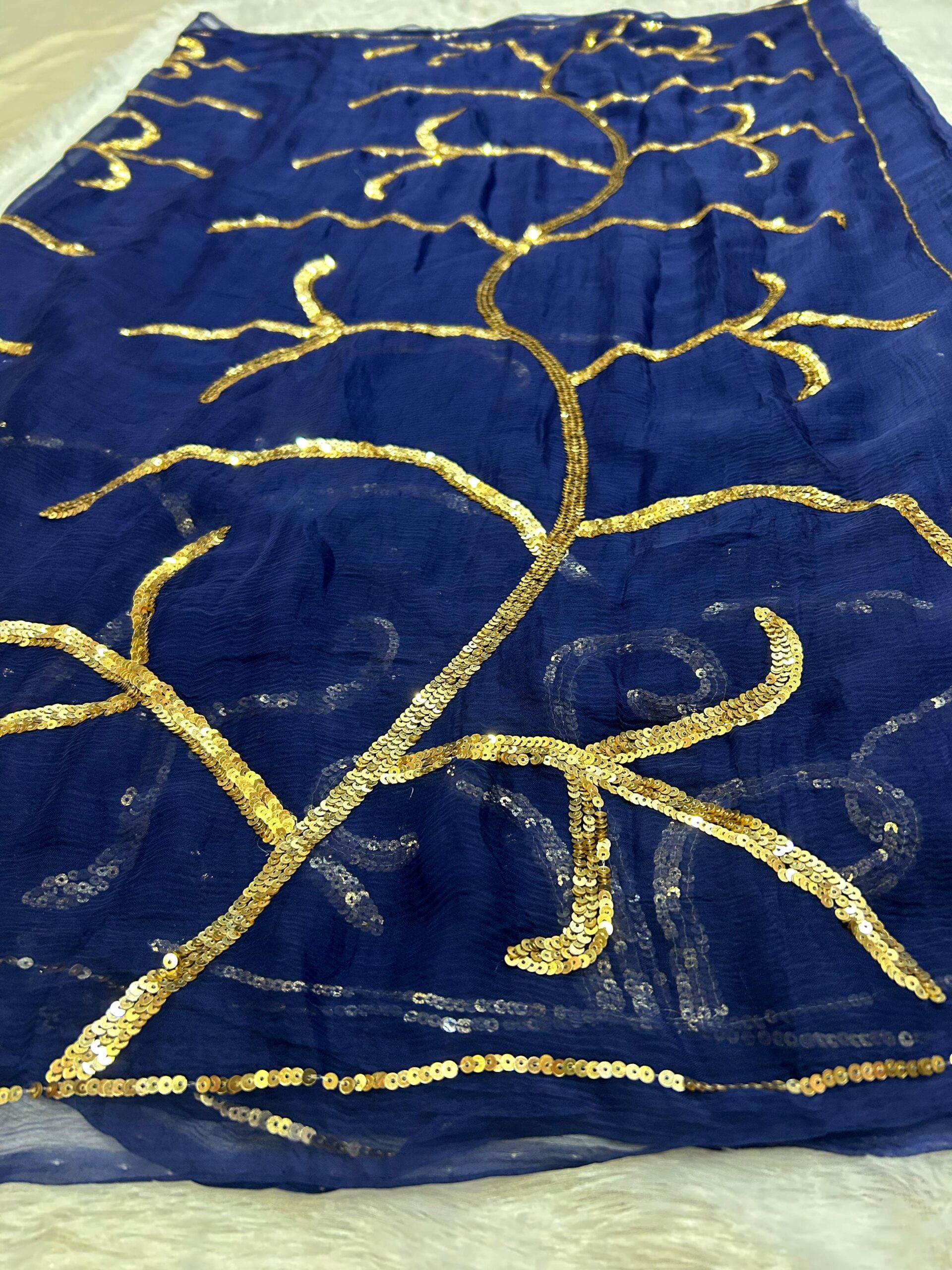 Embrace timeless elegance with this pure diamond chiffon saree, a masterpiece of delicate craftsmanship. The saree’s lightweight and airy drape ensures both comfort and grace, making you feel effortlessly chic. All over the saree, shimmering sequence work catches the light, creating a stunning, sparkling effect that’s both sophisticated and glamorous. This intricate detailing adds a touch of luxury without overwhelming the fabric’s natural beauty.
