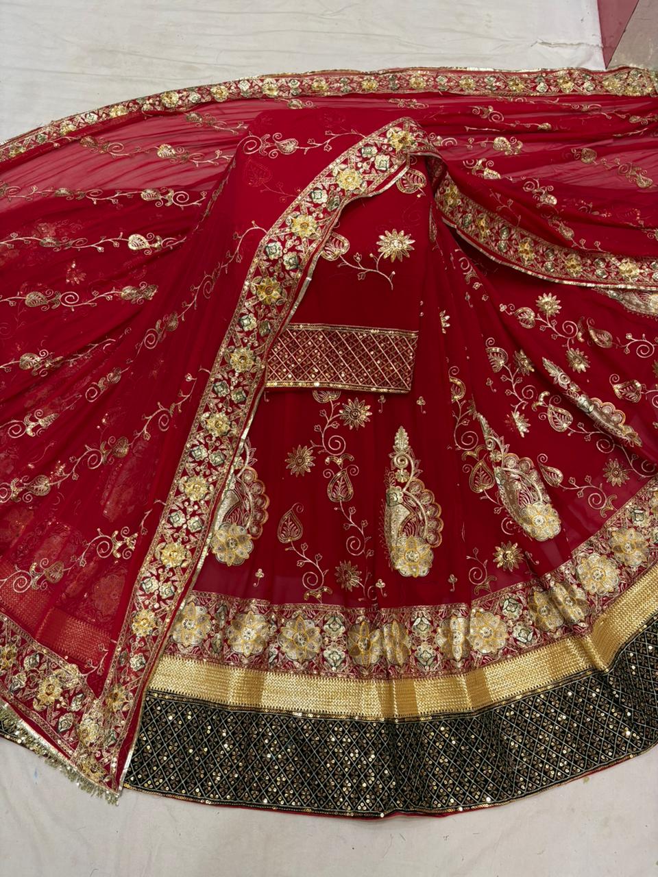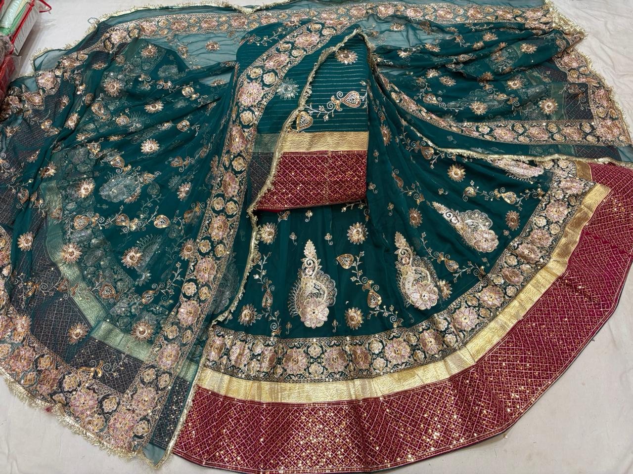 - Heavy Odhna (Veil): A flowing full odhna with a four-sided border that matches the heavy work of the lehenga, completing your stunning silhouette.