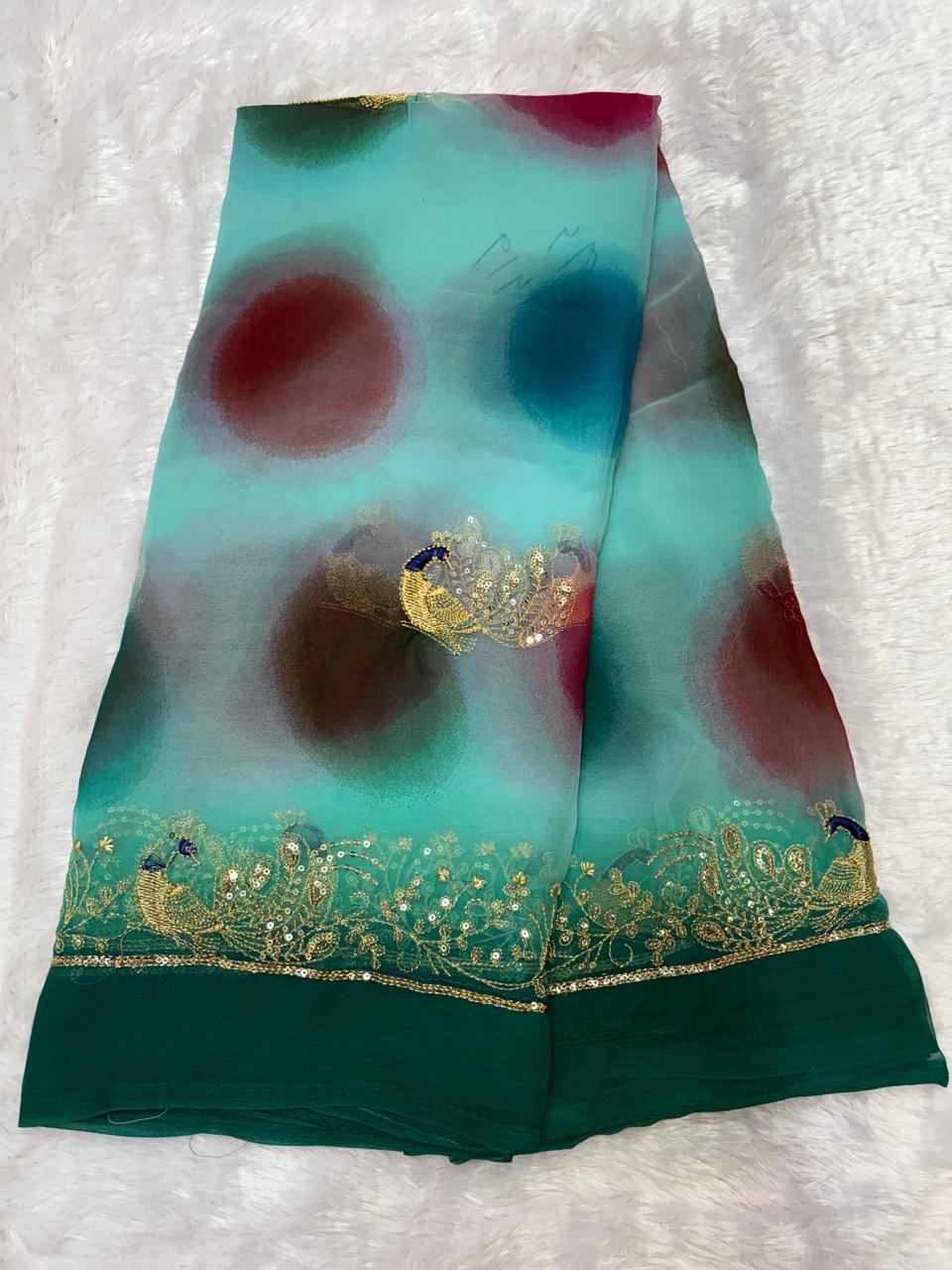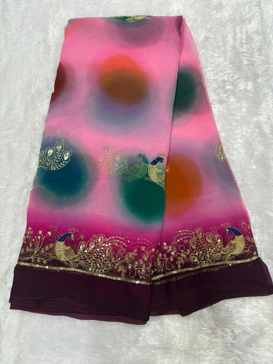 | Royal Georgette Fabric | Four Side Border & Multi-Shade Mor Design | Without Blouse |