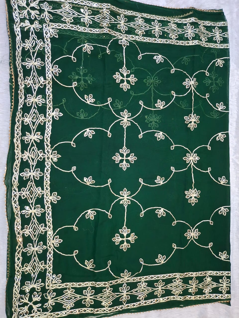 Exuding timeless elegance and traditional craftsmanship, this Royal Georgette Saree is a captivating choice for any special occasion. The luxurious Georgette fabric drapes beautifully, creating a graceful and flowing silhouette. Intricate Gota work, a traditional Indian embroidery technique using gold or silver lace, is meticulously hand-stitched across the border and pallu, adding a touch of regal splendor. Complementing the Gota work are delicate sequence embellishments that catch the light with every movement, creating a subtle yet dazzling shimmer.