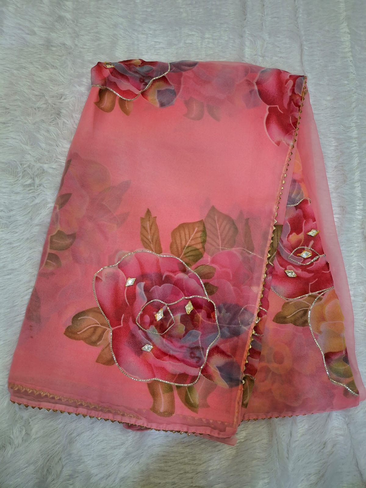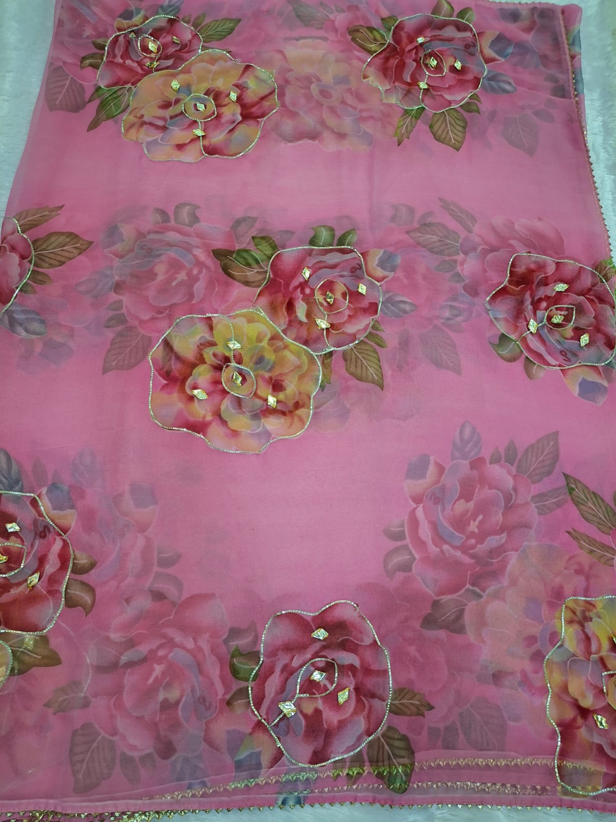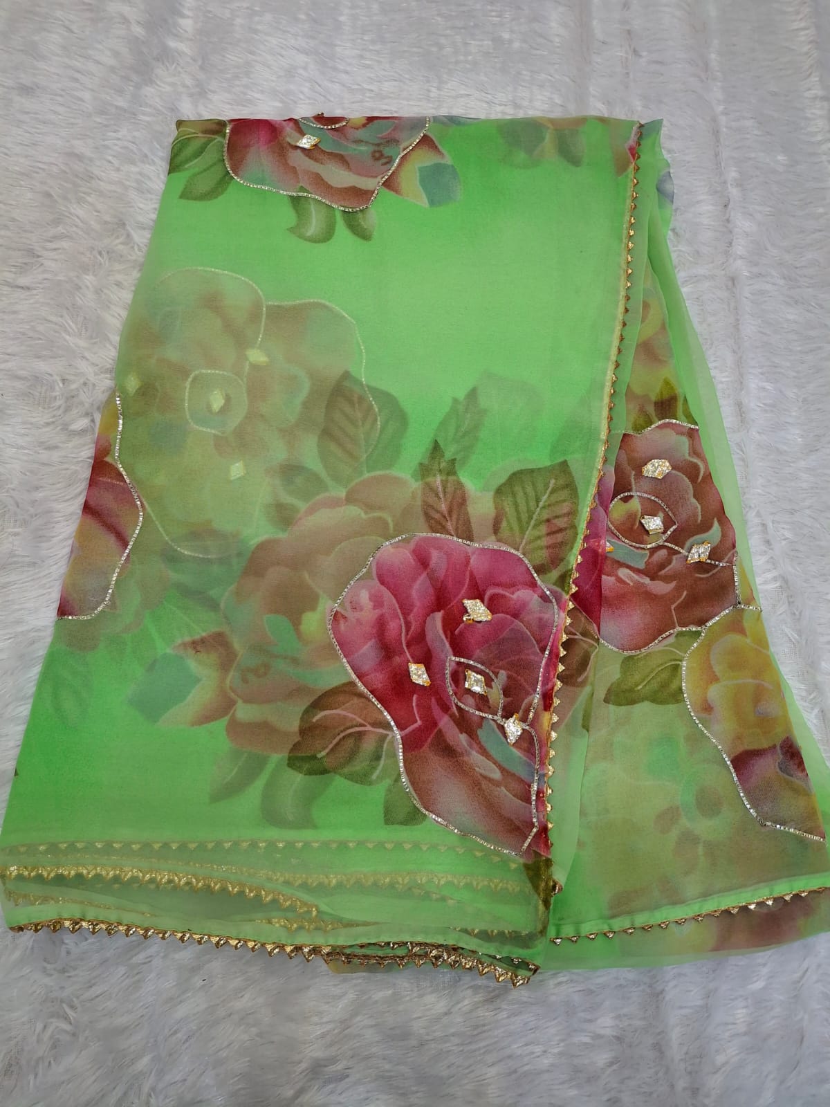 Royal Georgette “Kachi Gota Work” Floral Print Saree (With Blouse)