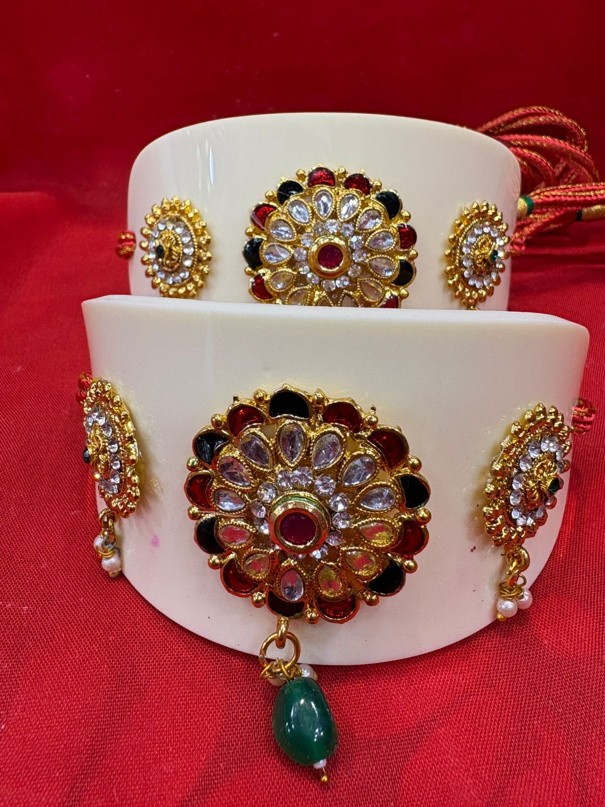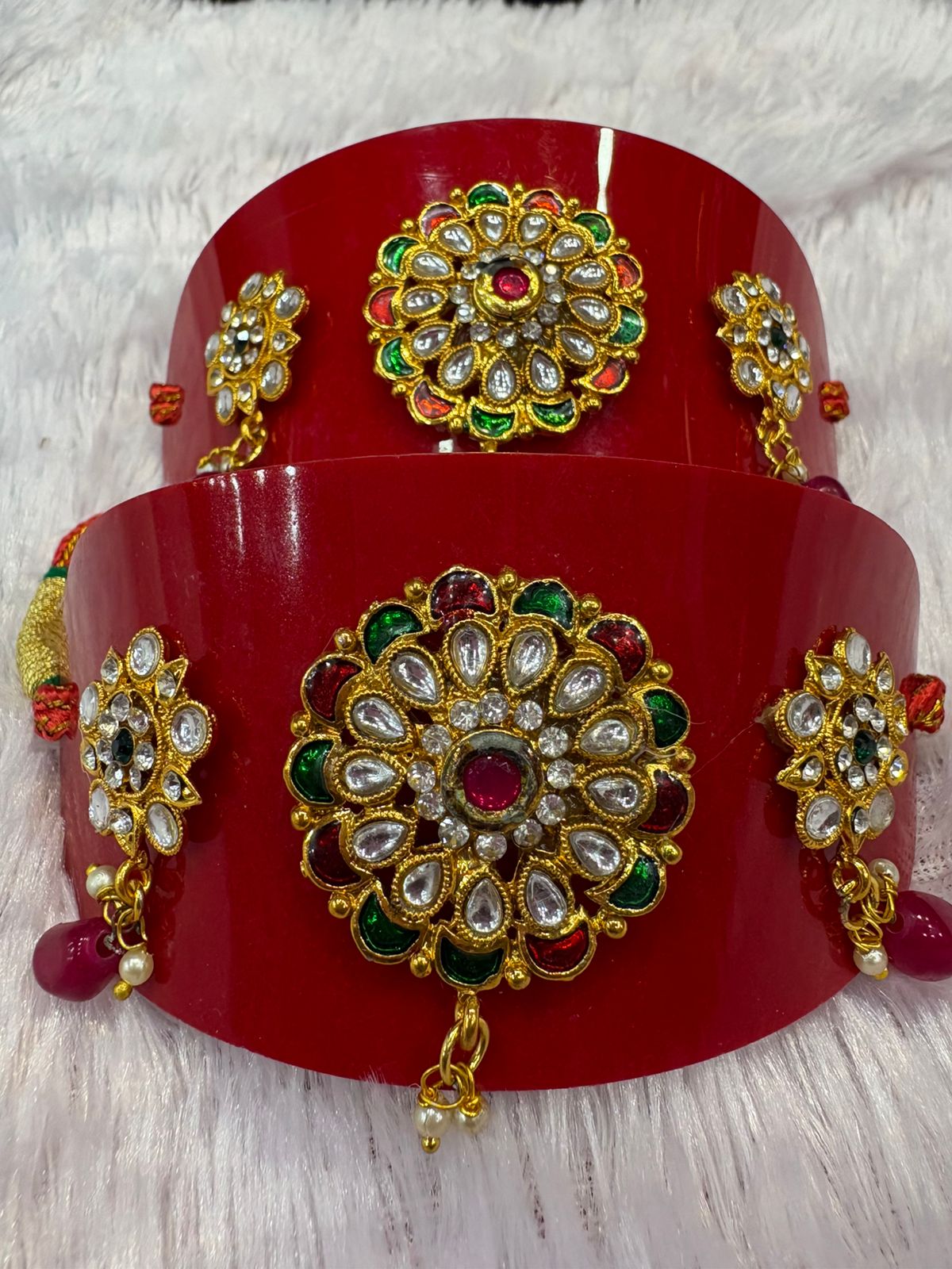 - Authentic Jadau Work: Handcrafted using the classic Jadau technique, where uncut glass stones (Kundan) are meticulously set into a base of metal, creating a brilliant, high-end finish.